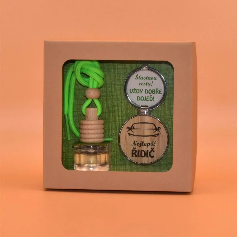 obsahuje přívěsek na klíče s textem: Nejlepší řidič, a osvěžovač vzduchu do auta na zavěšení. Sada je uložena v ručně vyrobené dárkové krabičce.
