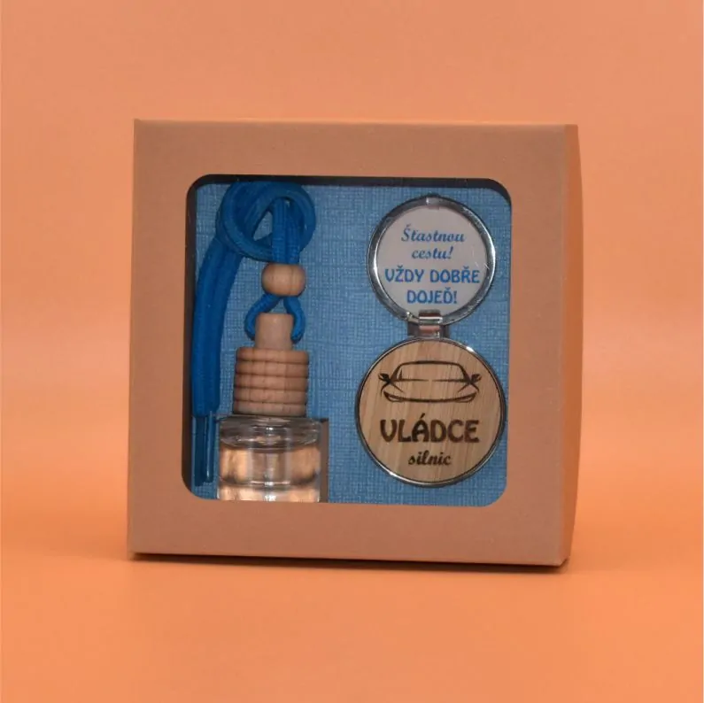 obsahuje přívěsek na klíče s textem: Vládce silnic, a osvěžovač vzduchu do auta na zavěšení. Sada je uložena v ručně vyrobené dárkové krabičce.