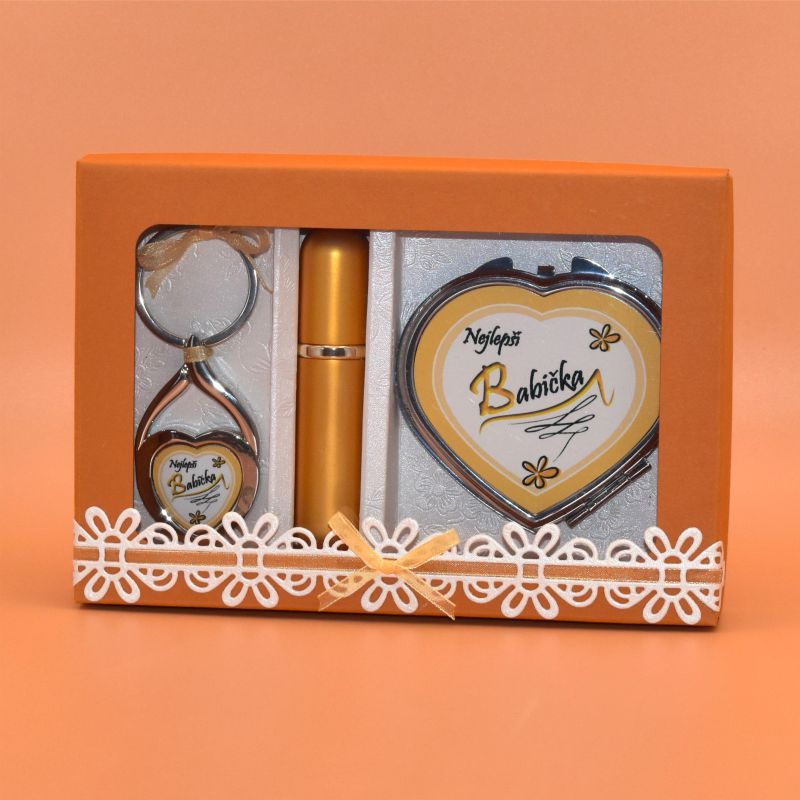 pro nejlepší babičku. Obsahuje klíčenku a zrcátko ve tvaru srdce s textem: Nejlepší babička a miniflakon na parfém. Celá sada je sladěna do zlatožluté barvy včetně ručně vyrobené krabičky.
