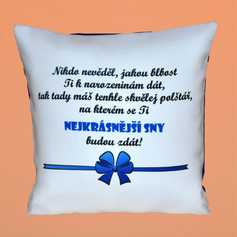 Nikdo nevěděl, jakou blbost Ti k narozeninám dát, tak tady máš tenhle skvělej polštář, na kterým se Ti ty nejkrásnější sny budou zdát! Polštář je jednostranně tištěný profesionální sublimací. Z druhé strany jednobarevný.