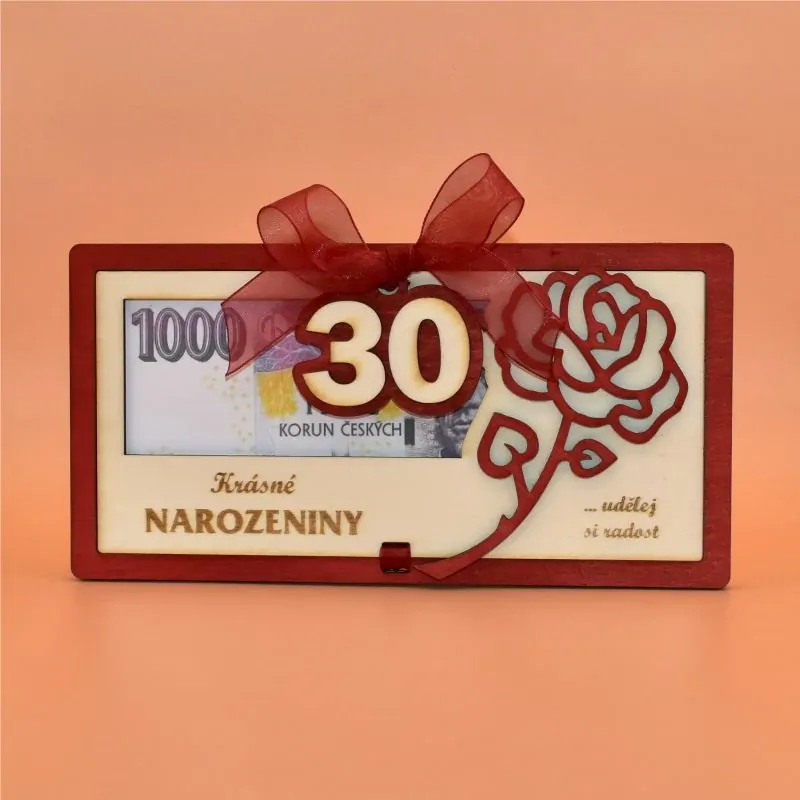 Dřevěné pouzdro z překližky s dekoračním výřezem ve tvaru růže, se zavěšeným číslem výročí, určené k darování peněz. Součástí je ručně vyrobená dárková obálka s malou dřevěnou růžičkou.