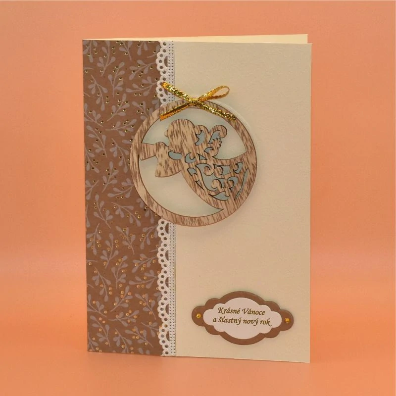 k Vánocům zdobené dřevěným výřezem ve tvaru kouličky s andílkem. Uvnitř s textem. Dodáváme v celofánovém obalu.