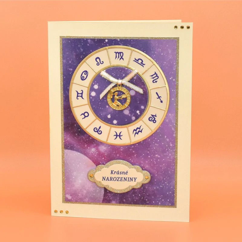 k narozeninám s kovovým přívěskem zobrazujícím jednotlivá znamení zvěrokruhu. Kromě textu obsahuje také vloženou kartu se stručnou charakteristikou daného znamení. Dodáváme v celofánovém obalu.
