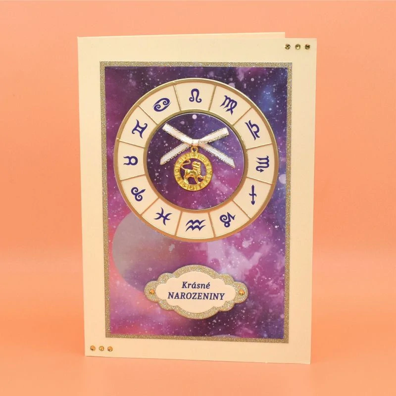 k narozeninám s kovovým přívěskem zobrazujícím jednotlivá znamení zvěrokruhu. Kromě textu obsahuje také vloženou kartu se stručnou charakteristikou daného znamení. Dodáváme v celofánovém obalu.