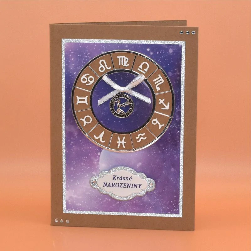 k narozeninám s kovovým přívěskem zobrazujícím jednotlivá znamení zvěrokruhu. Kromě textu obsahuje také vloženou kartu se stručnou charakteristikou daného znamení. Dodáváme v celofánovém obalu.