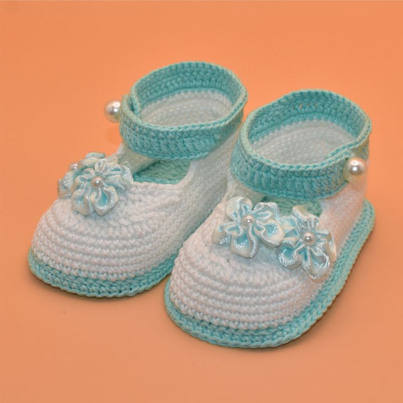 pro miminko, s podrážkou mentolové barvy, ozdobené saténovými květinkami. Na kotníku plastová perlička jako knoflík. Určeno pro děti ve věku 0-3 měsíce. Certifikát na příze určené na výrobky pro děti do 3 let ke stažení. Dodáváme v transparentní plastové krabičce.