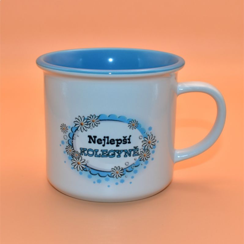 s modrým vnitřkem oboustranně potištěný. Z přední strany motiv: Nejlepší kolegyně, na druhé straně drobný vzor. Hrnek je tištěný profesionální sublimací. Díky vysoce kvalitnímu polymerovému povlaku dobře snáší mytí v myčce nádobí a i po desítkách mytí si zachovává barvy obrázků na něm vytištěných. Dodáváme v kartonové krabičce.
