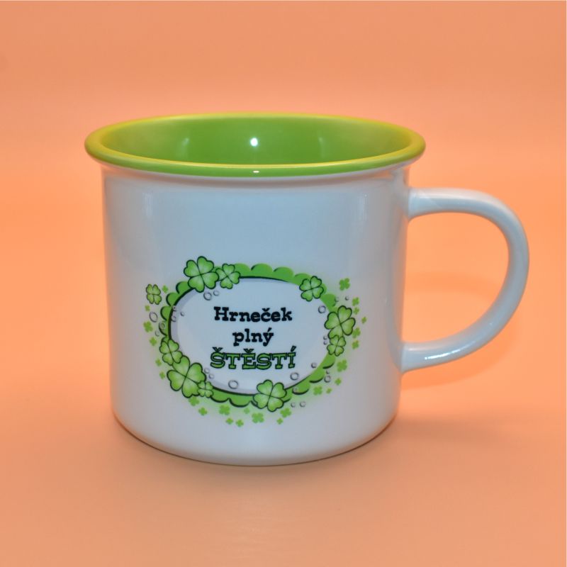 se zeleným vnitřkem oboustranně potištěný. Z přední strany motiv: Hrneček plný stěstí, na druhé straně drobný vzor. Hrnek je tištěný profesionální sublimací. Díky vysoce kvalitnímu polymerovému povlaku dobře snáší mytí v myčce nádobí a i po desítkách mytí si zachovává barvy obrázků na něm vytištěných. Dodáváme v kartonové krabičce.