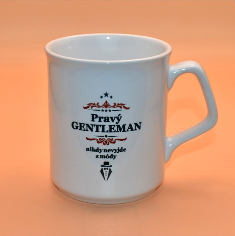 oboustranně potištěný profesionální sublimací. Motiv: Pravý gentleman nikdy nevyjde z módy! Díky vysoce kvalitnímu polymerovému povlaku dobře snáší mytí v myčce nádobí a i po desítkách mytí si zachovává barvy obrázků na něm vytištěných. Dodáváme v kartonové krabičce.