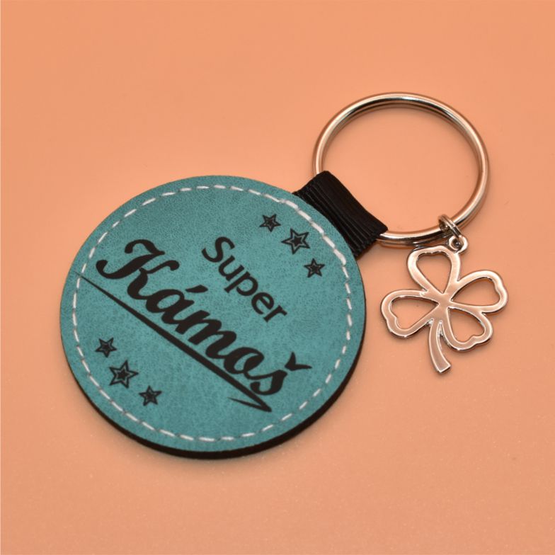 ze syntetické kůže s textem - Super kámoš a s kovovým přívěskem v podobě čtyřlístku. Na výběr jsou dvě barevné varianty - zelenomodrá, nebo hnědá. Klíčenka je jednostranně potištěná, je možné ji potisknout i z druhé strany. Baleno v ručně vyrobené krabičce odpovídající barvě klíčenky.
