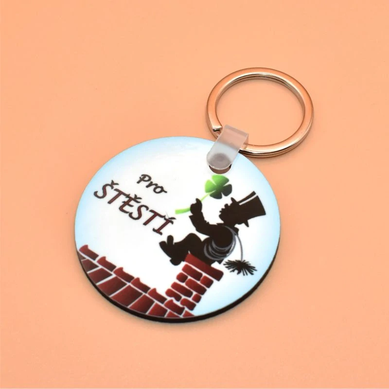 oboustranně potištěný obrázkem kominíka a textem - pro štěstí. Klíčenku dodáváme balenou v celofánovém sáčku.
