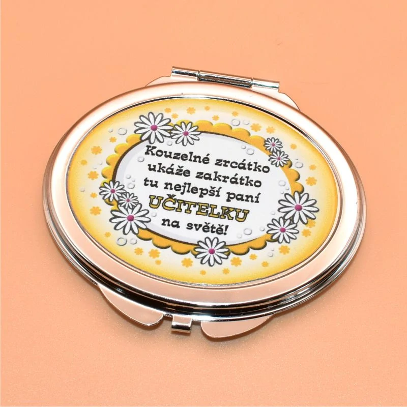 elegantního jednoduchého designu s textem: Kouzelné zrcátko ukáže zakrátko tu nejlepší paní učitelku na světě. Zadní strana zrcátka je dekorována. Dodáváme v celofánovém obalu.