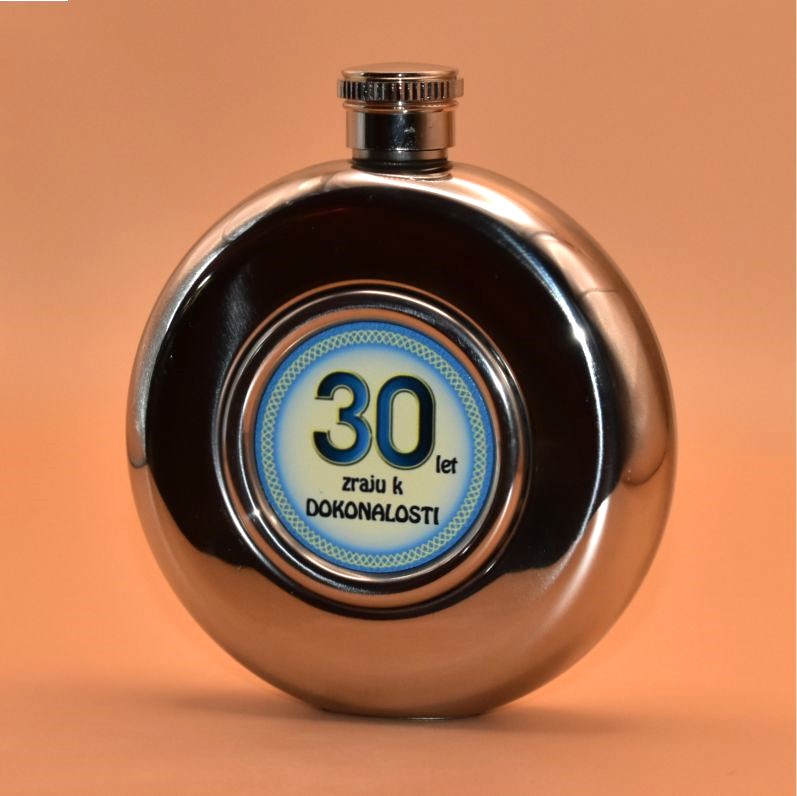 Z přední strany kulatý kovový štítek s textem o rozměrech 38x38 mm. Dodáváme v papírové krabičce.