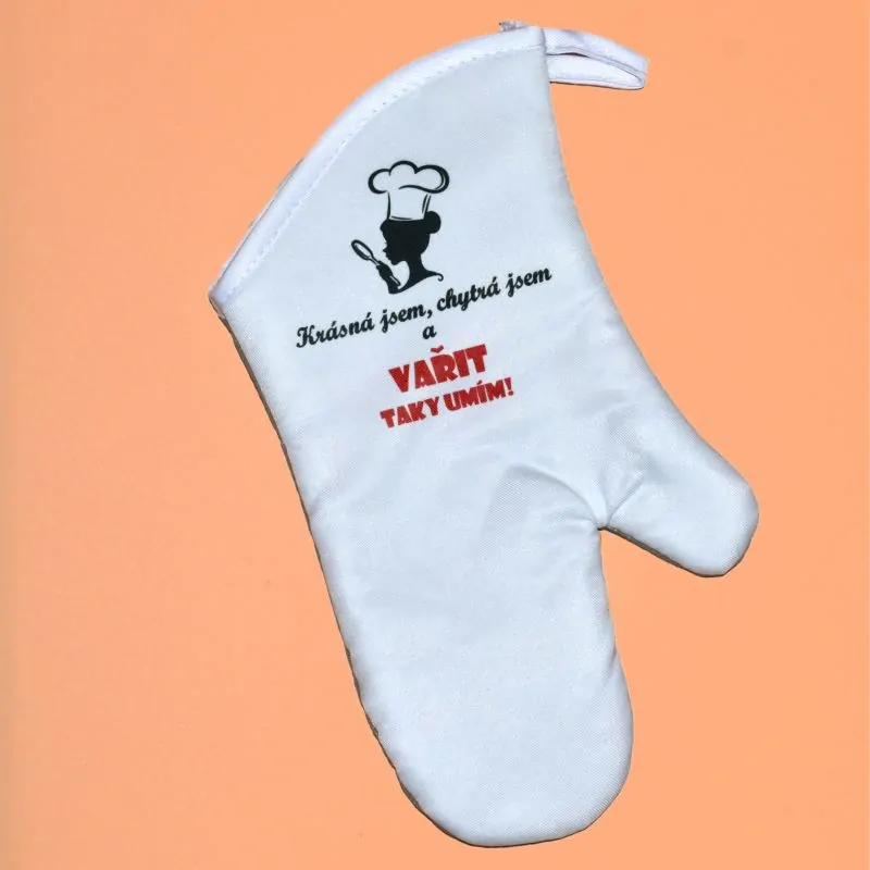 tištěná profesionální sublimací. Text: Krásná jsem, chytrá jsem a vařit taky umím.