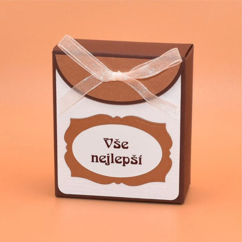 v ručně vyrobené dárkové krabičce. Na krabičce je v ozdobném rámečku krátký text.