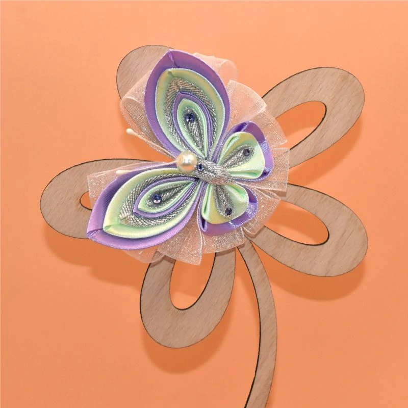 je vyrobený technikou kanzashi ze saténových stuh. Motýlka lze připevnit kovovou sponkou umístěnou na spodní části. Výrobek je kompletně ruční práce včetně dárkové krabičky.