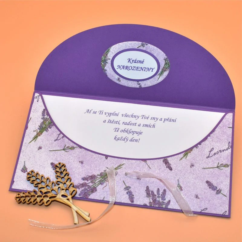 z dekoračního papíru, s dřevěným výřezem ve tvaru levandule, určená k darování peněz, uvnitř s textem. Dodáváme v celofánovém obalu.