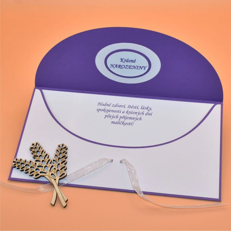 z dekoračního papíru, s dřevěným výřezem ve tvaru levandule, určená k darování peněz, uvnitř s textem. Dodáváme v celofánovém obalu.