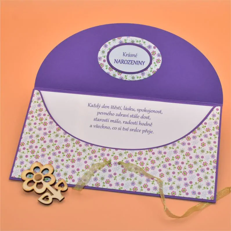 z dekoračního papíru, s dřevěným výřezem ve tvaru květiny, určená k darování peněz, uvnitř s textem. Dodáváme v celofánovém obalu.