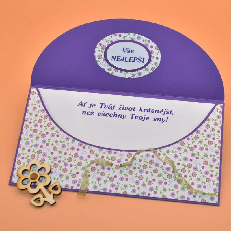 z dekoračního papíru, s dřevěným výřezem ve tvaru květiny, určená k darování peněz, uvnitř s textem. Dodáváme v celofánovém obalu.