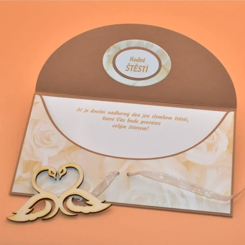 z dekoračního papíru, s dřevěným výřezem ve tvaru dvou labutí, určená k darování peněz, uvnitř s textem. Dodáváme v celofánovém obalu.