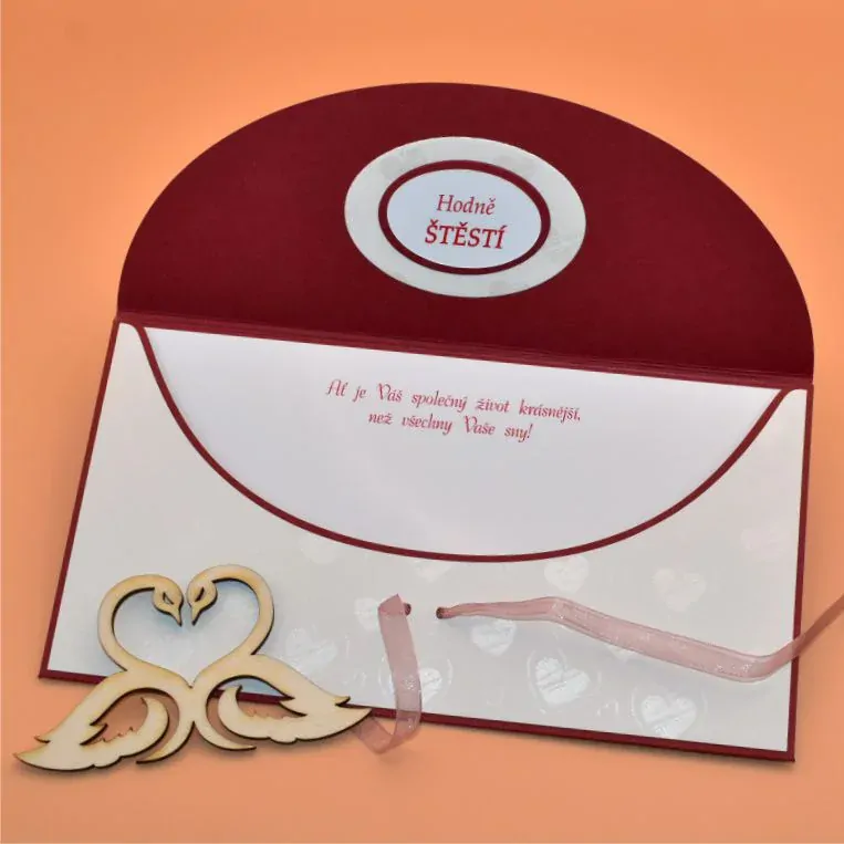 z dekoračního papíru, s dřevěným výřezem ve tvaru dvou labutí, určená k darování peněz, uvnitř s textem. Dodáváme v celofánovém obalu.