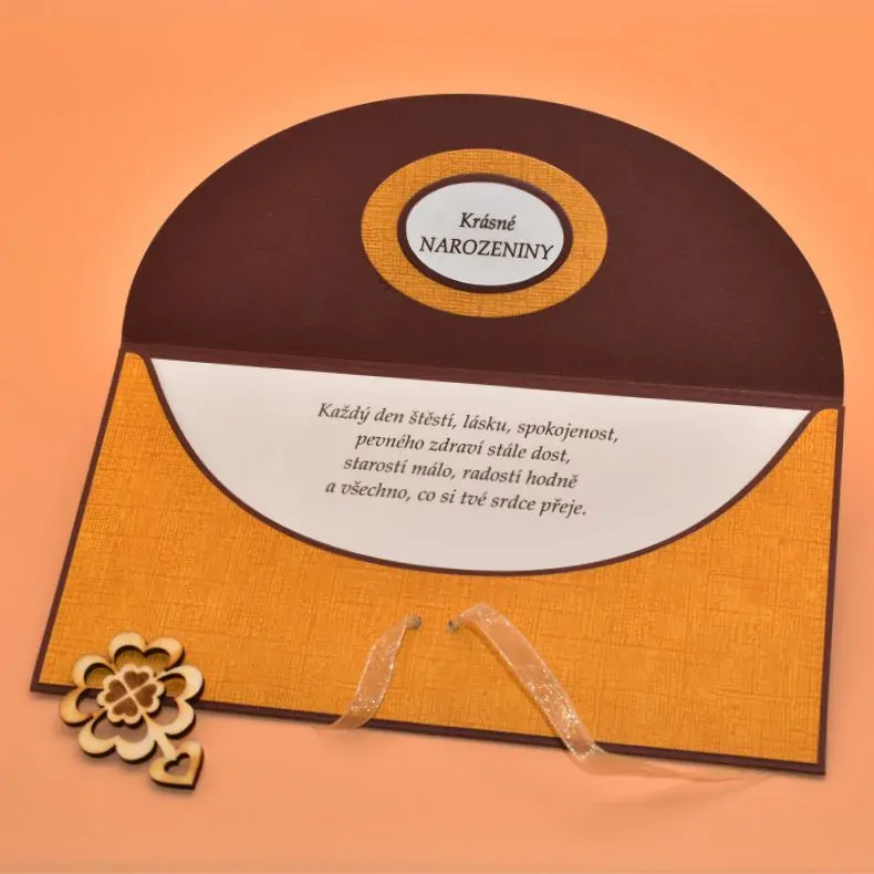 z dekoračního papíru, s dřevěným výřezem ve tvaru čtyřlístku, určená k darování peněz, uvnitř s textem. Dodáváme v celofánovém obalu.