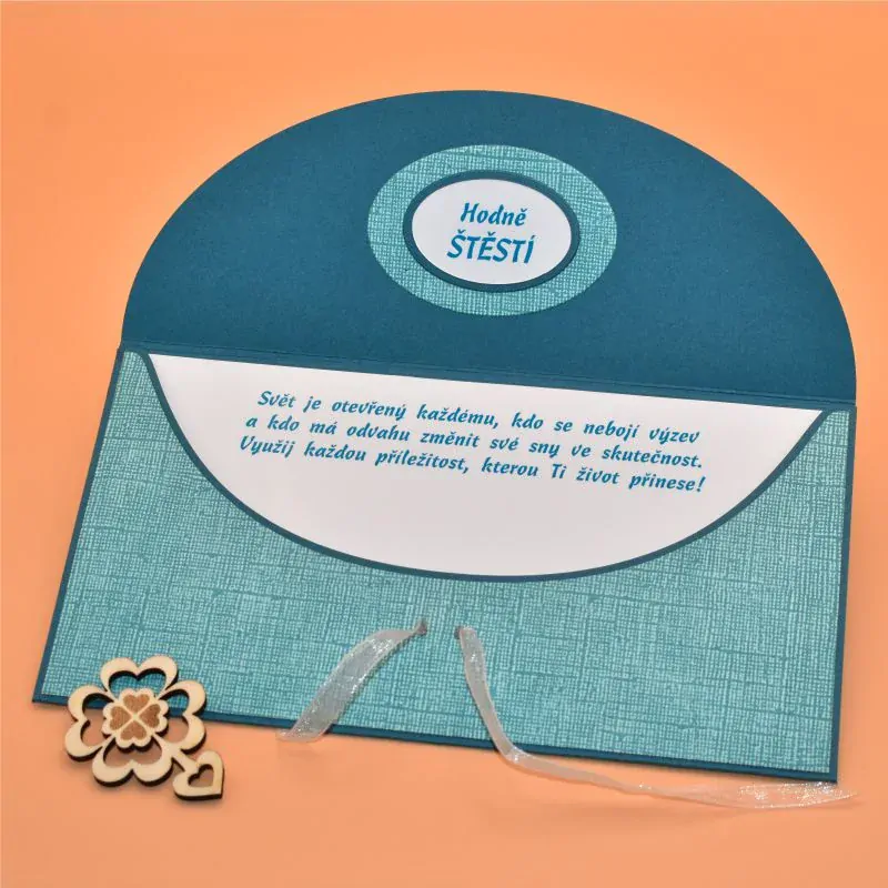 z dekoračního papíru, s dřevěným výřezem ve tvaru čtyřlístku, určená k darování peněz, uvnitř s textem. Dodáváme v celofánovém obalu.