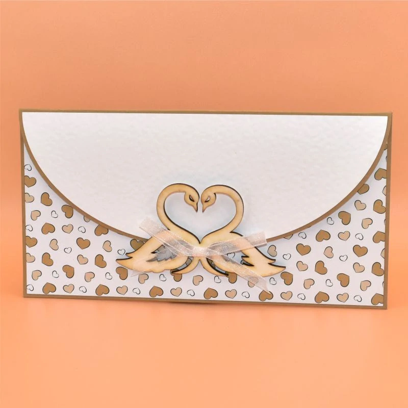 z dekoračního papíru, s dřevěným výřezem ve tvaru dvou labutí, určená k darování peněz, uvnitř s textem. Dodáváme v celofánovém obalu.