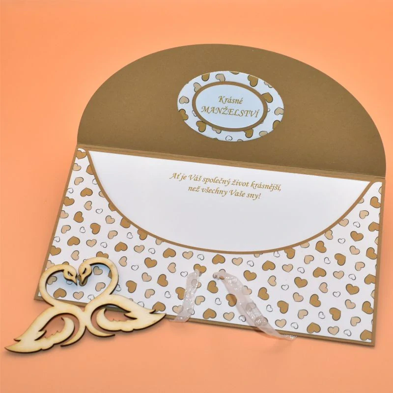 z dekoračního papíru, s dřevěným výřezem ve tvaru dvou labutí, určená k darování peněz, uvnitř s textem. Dodáváme v celofánovém obalu.
