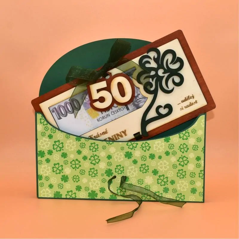 Dřevěné pouzdro z překližky s dekoračním výřezem ve tvaru čtyřlístku, se zavěšeným číslem výročí, určené k darování peněz. Součástí je ručně vyrobená dárková obálka s malým dřevěným čtyřlístkem.