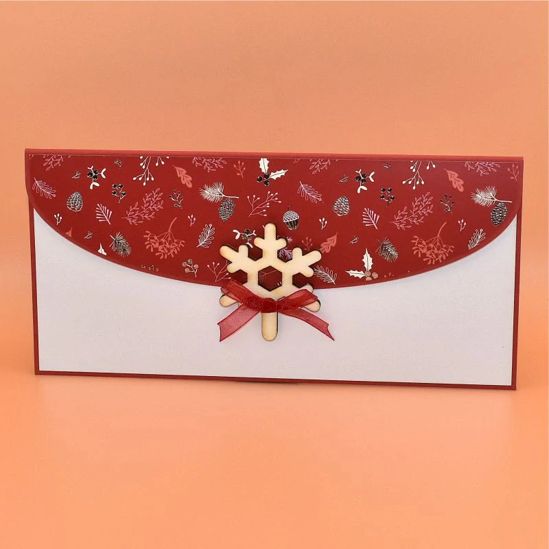 z dekoračního papíru, s dřevěným výřezem ve tvaru vločky, určená k darování peněz. Dřevěný výřez slouží jako kolíček k uzavření obálky - zasune se do připraveného očka. Dodáváme v celofánovém obalu.