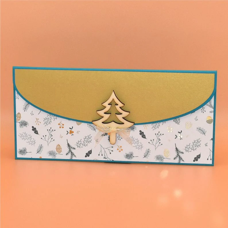 z dekoračního papíru, s dřevěným výřezem ve tvaru stromku, určená k darování peněz. Dřevěný výřez slouží jako kolíček k uzavření obálky - zasune se do připraveného očka. Dodáváme v celofánovém obalu.