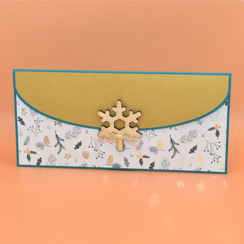 z dekoračního papíru, s dřevěným výřezem ve tvaru vločky, určená k darování peněz. Dřevěný výřez slouží jako kolíček k uzavření obálky - zasune se do připraveného očka. Dodáváme v celofánovém obalu.