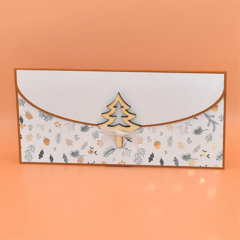 z dekoračního papíru, s dřevěným výřezem ve tvaru stromku, určená k darování peněz. Dřevěný výřez slouží jako kolíček k uzavření obálky - zasune se do připraveného očka. Dodáváme v celofánovém obalu.