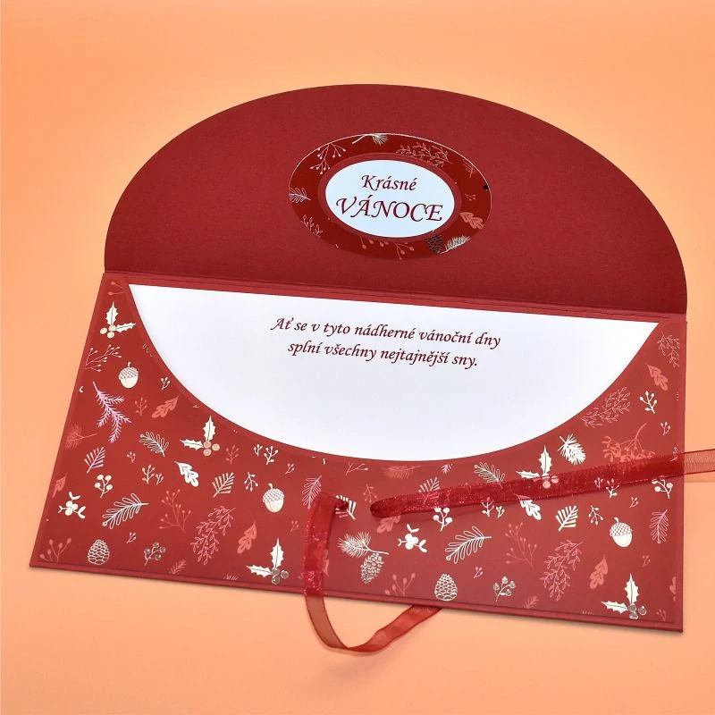 z dekoračního papíru, s dřevěným výřezem ve tvaru zvonku, určená k darování peněz, uvnitř s textem. Dřevěnou ozdobu lze využít jako dekoraci k zavěšení. Dodáváme v celofánovém obalu.
