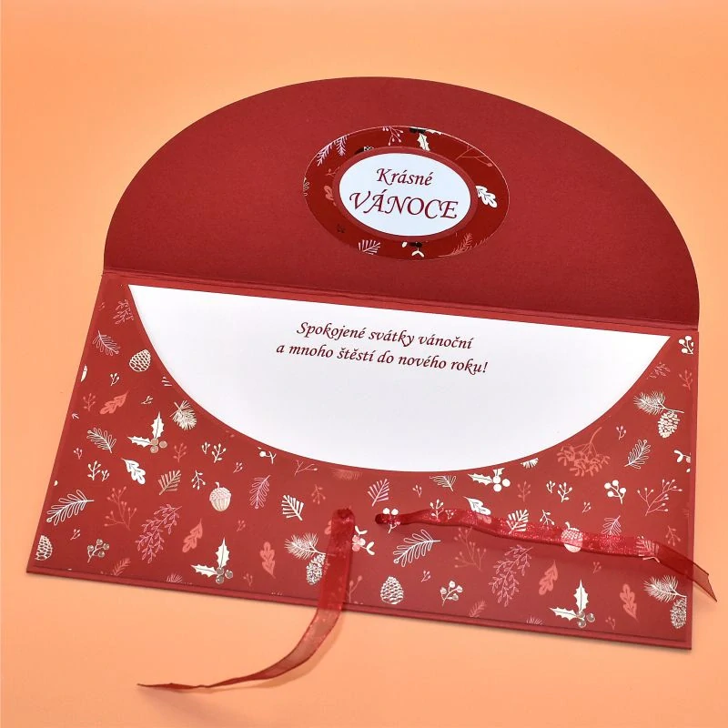 z dekoračního papíru, s dřevěným výřezem ve tvaru zvonku, určená k darování peněz, uvnitř s textem. Dřevěnou ozdobu lze využít jako dekoraci k zavěšení. Dodáváme v celofánovém obalu.