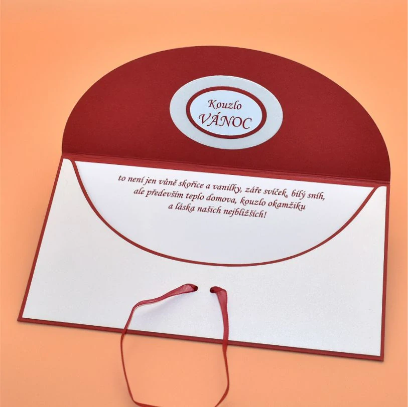 z dekoračního papíru, s dřevěným výřezem ve tvaru vločky, určená k darování peněz, uvnitř s textem. Dřevěnou ozdobu lze využít jako dekoraci k zavěšení. Dodáváme v celofánovém obalu.