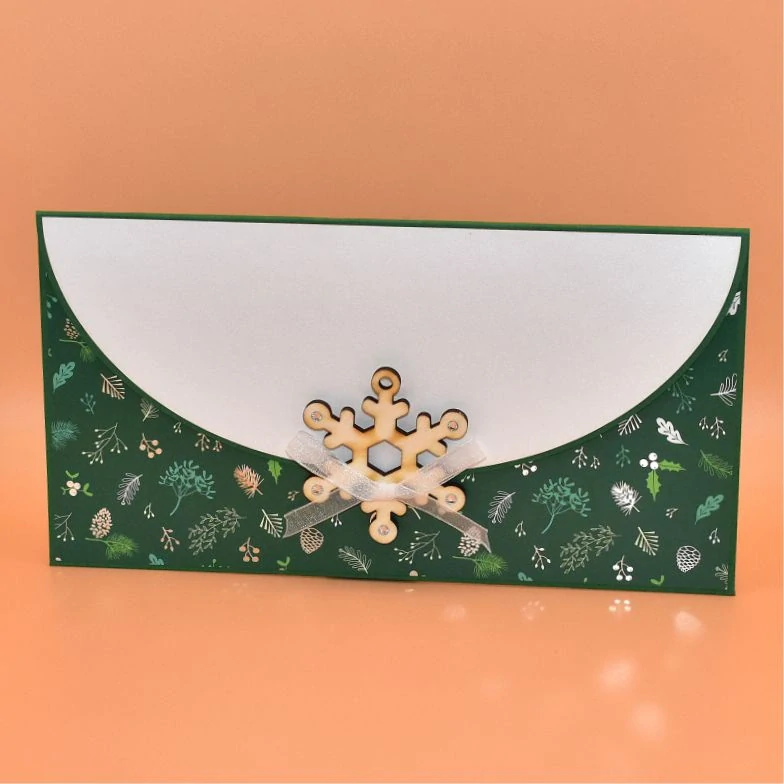 z dekoračního papíru, s dřevěným výřezem ve tvaru vločky, určená k darování peněz, uvnitř s textem. Dřevěnou ozdobu lze využít jako dekoraci k zavěšení. Dodáváme v celofánovém obalu.