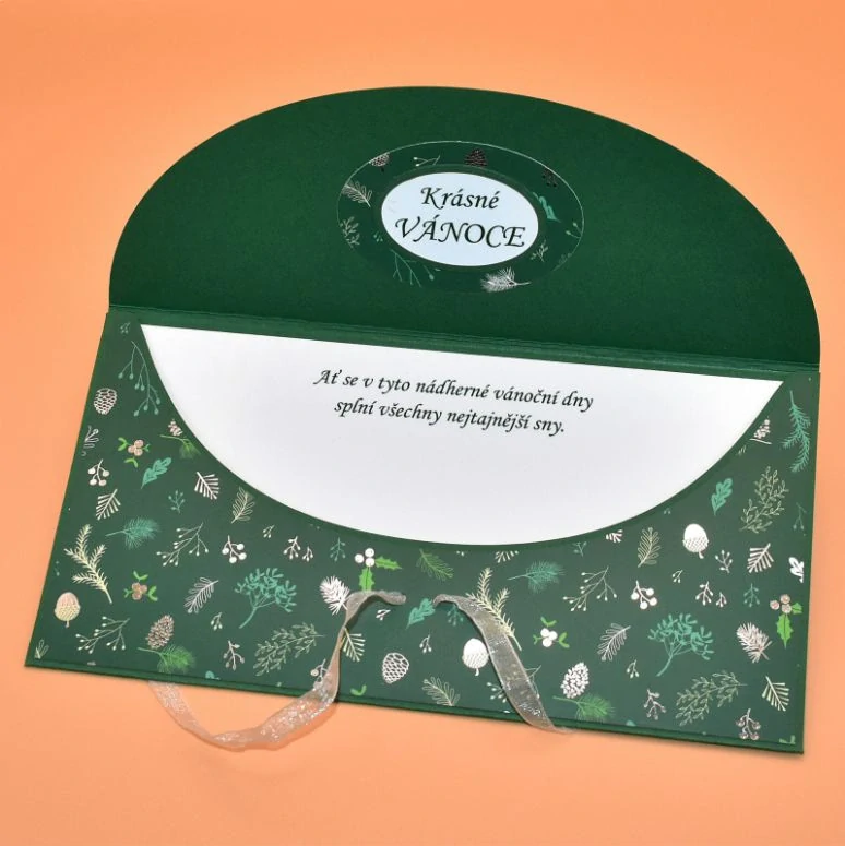 z dekoračního papíru, s dřevěným výřezem ve tvaru vločky, určená k darování peněz, uvnitř s textem. Dřevěnou ozdobu lze využít jako dekoraci k zavěšení. Dodáváme v celofánovém obalu.