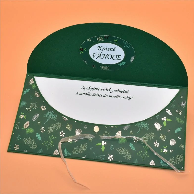 z dekoračního papíru, s dřevěným výřezem ve tvaru vločky, určená k darování peněz, uvnitř s textem. Dřevěnou ozdobu lze využít jako dekoraci k zavěšení. Dodáváme v celofánovém obalu.