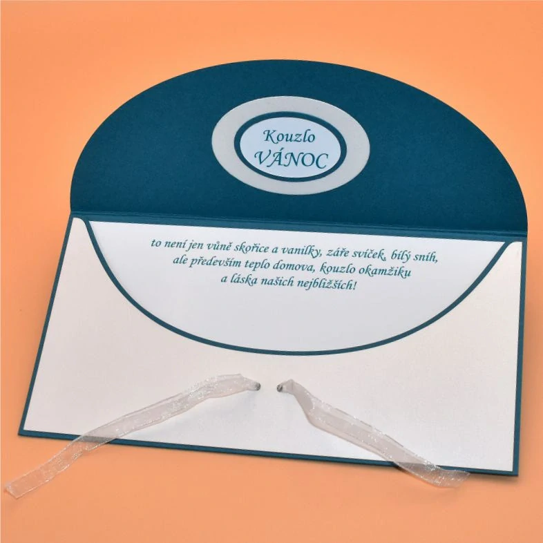 z dekoračního papíru, s dřevěným výřezem ve tvaru zvonku, určená k darování peněz, uvnitř s textem. Dřevěnou ozdobu lze využít jako dekoraci k zavěšení. Dodáváme v celofánovém obalu.