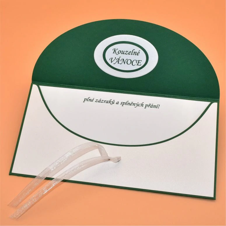 z dekoračního papíru, s dřevěným výřezem ve tvaru zvonku, určená k darování peněz, uvnitř s textem. Dřevěnou ozdobu lze využít jako dekoraci k zavěšení. Dodáváme v celofánovém obalu.