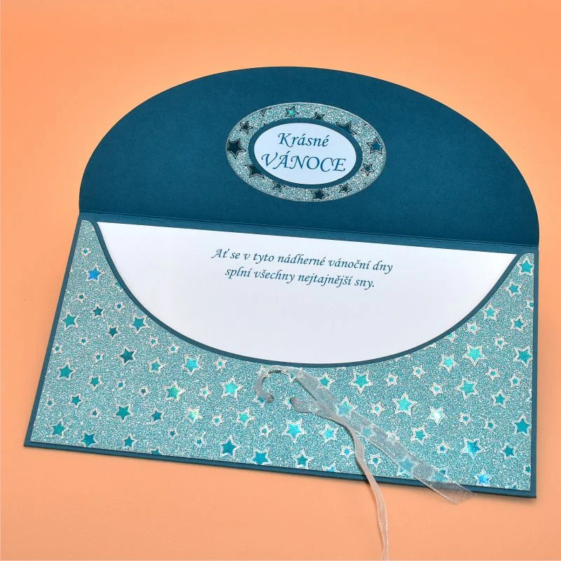 z dekoračního papíru, s dřevěným výřezem ve tvaru zvonku, určená k darování peněz, uvnitř s textem. Dřevěnou ozdobu lze využít jako dekoraci k zavěšení. Dodáváme v celofánovém obalu.