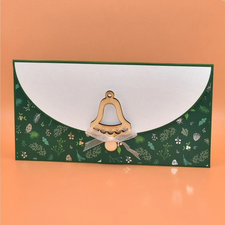 z dekoračního papíru, s dřevěným výřezem ve tvaru zvonku, určená k darování peněz, uvnitř s textem. Dřevěnou ozdobu lze využít jako dekoraci k zavěšení. Dodáváme v celofánovém obalu.