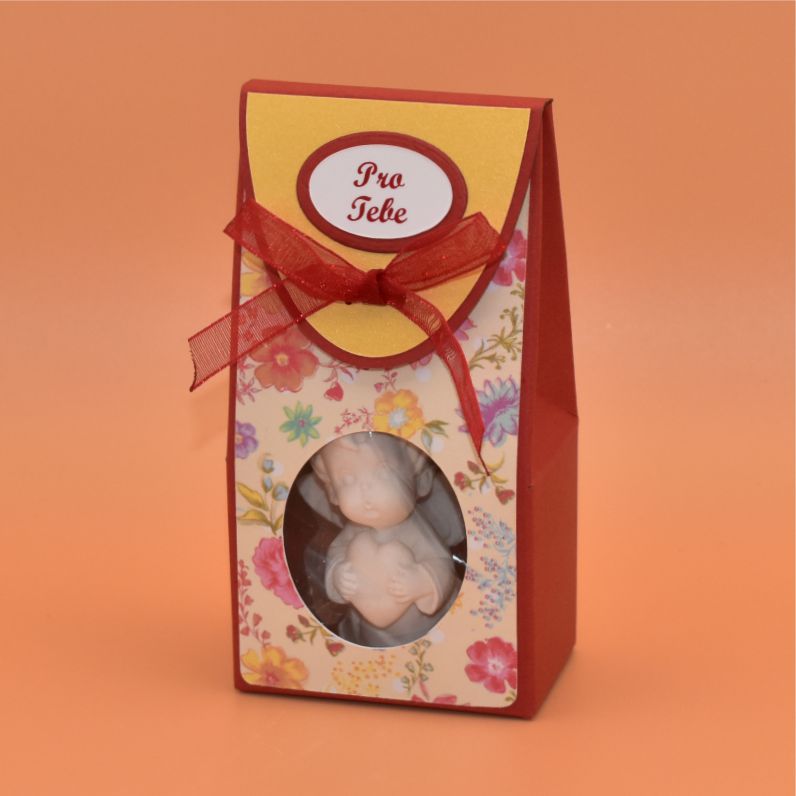 ve tvaru andílka se srdcem v dárkové krabičce. Výrobek je kompletně ruční výroby.