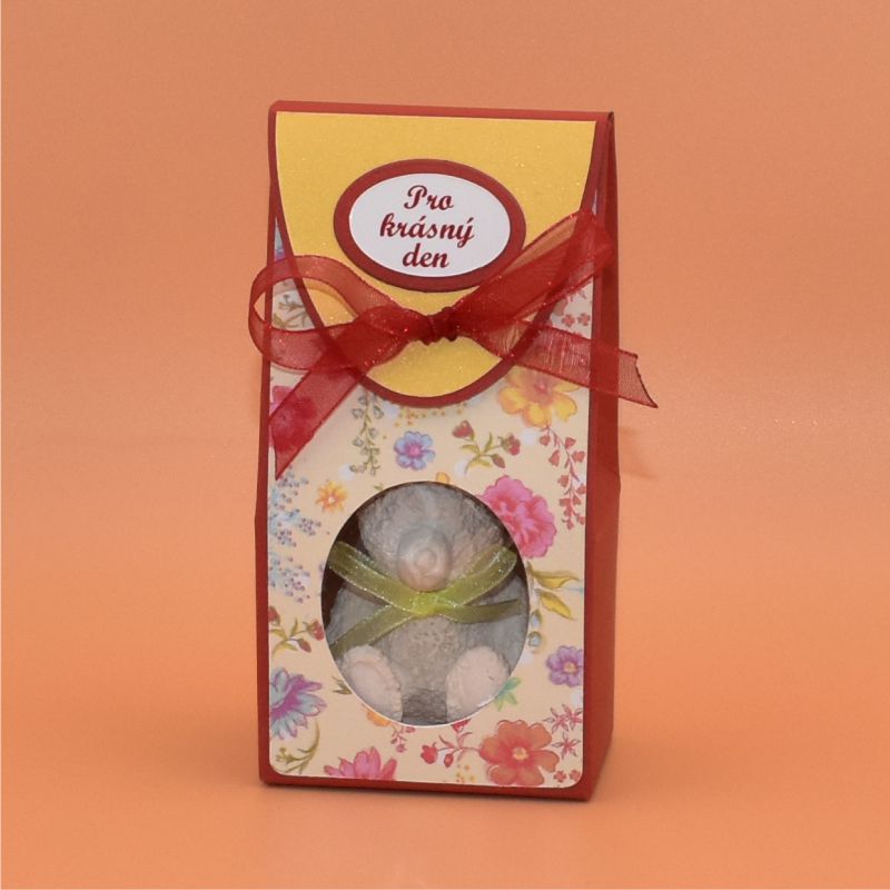 ve tvaru medvěda s monofilovou mašličkou v dárkové krabičce. Výrobek je kompletně ruční výroby.