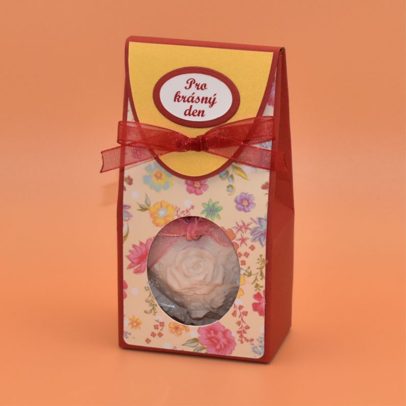ve tvaru srdce s růží, s monofilovou mašličkou na zavěšení, v dárkové krabičce. Výrobek je kompletně ruční výroby.